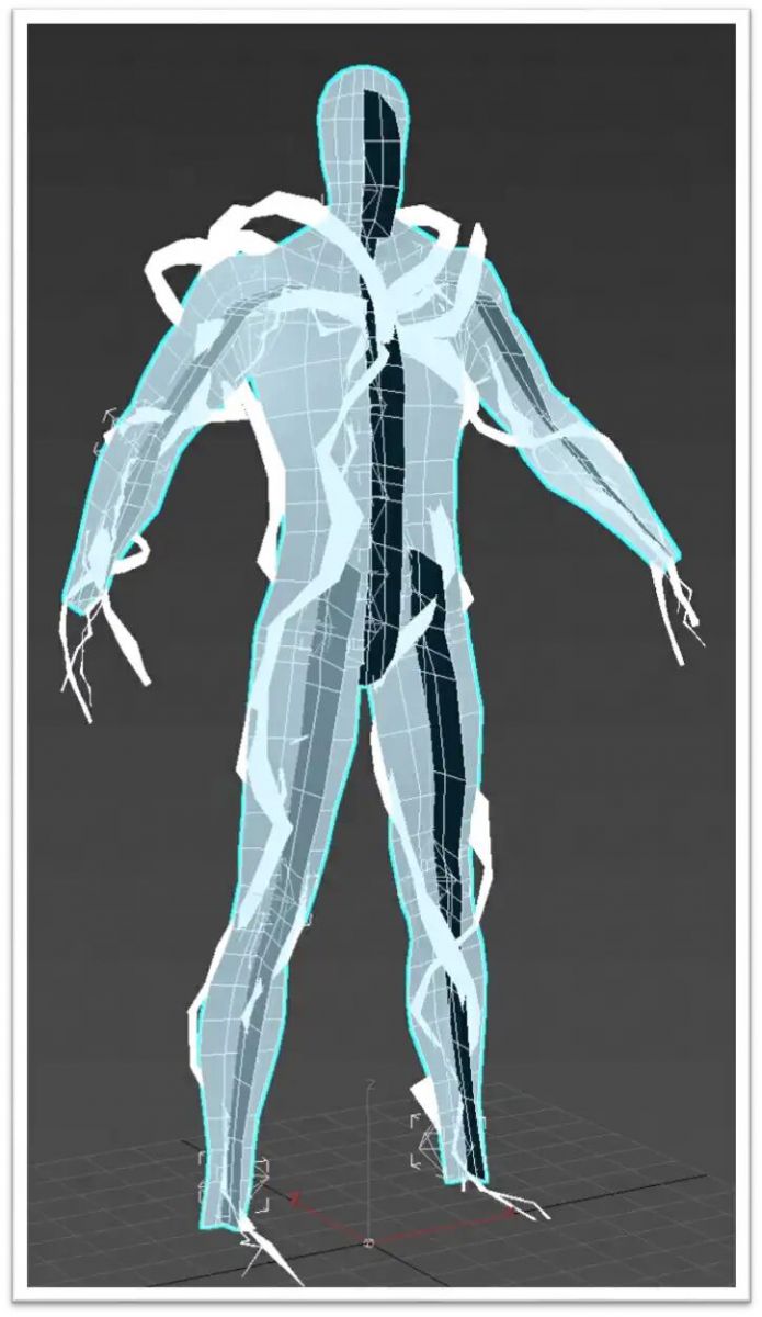用闪电模型构建身体的经脉走向,实现人体经脉流动的闪电效果,再进行动画控制制作,通过UV走形实现从胸口向四肢的生长过程:
