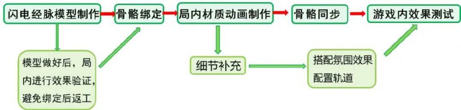 处理方式:根据角色制作闪电经脉的模型,这里的模型则是完全模拟了闪电的轨迹效果定制,然后同步绑定游戏标准的骨骼框架,在引擎内通过骨骼同步工具再同步绑定到对应的奥义表演动画上。
