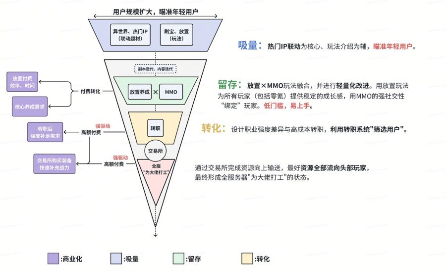 我们在深度体验后发现,游戏主要通过异世界、热门IP扩大用户规模,瞄准年轻用户。利用轻度放置与轻度MMO玩法融合,营造低门槛、易上手的前期体验。随后通过内容副本迭代与高成本转职筛选用户,用通过交易行完成资源的向上输送,最终形成全服“为大佬打工”的局面,并实现盈利。游戏的产品模型可参考下图: