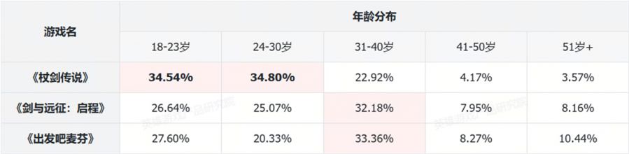 事实证明,这样的宣发方式也的确吸引到了相对年轻化的一批玩家。与《剑与远征:启程》及《出发吧麦芬》相比,其玩家的年龄分布显著更年轻。