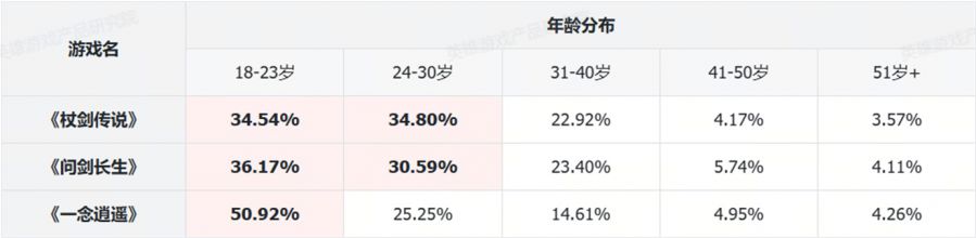 此外,我们还发现雷霆旗下的游戏《问剑长生》(2024年末)、《一念逍遥》(2021年初)的年龄分布与《杖剑传说》相似度较高,人群画像普遍偏向年轻群体。