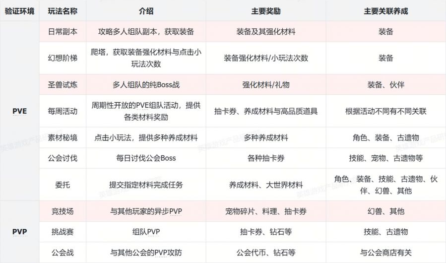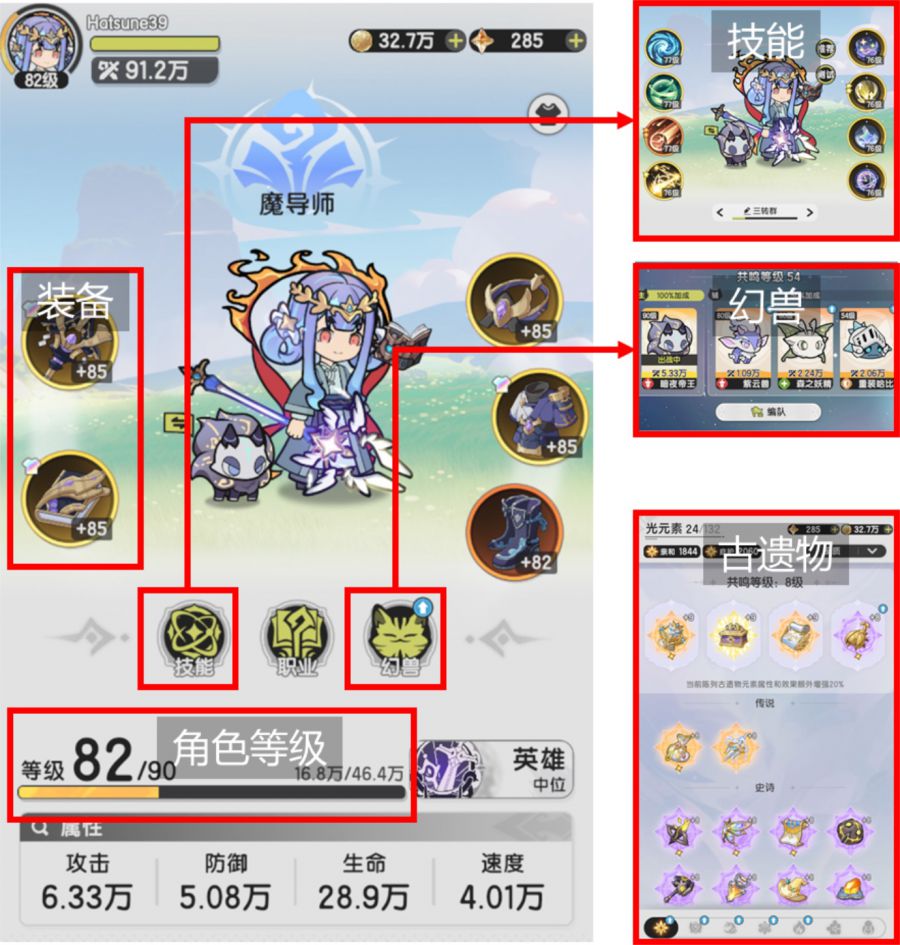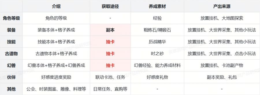 作为一款本质上无限成长的数值卡牌,兼顾深度与广度。游戏内玩家的核心养成项为等级、装备、技能、幻兽、古遗物,除此之外还包括伙伴、时装等其他养成内容。