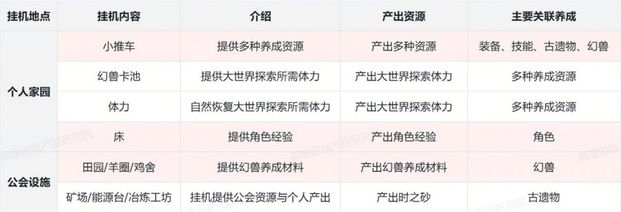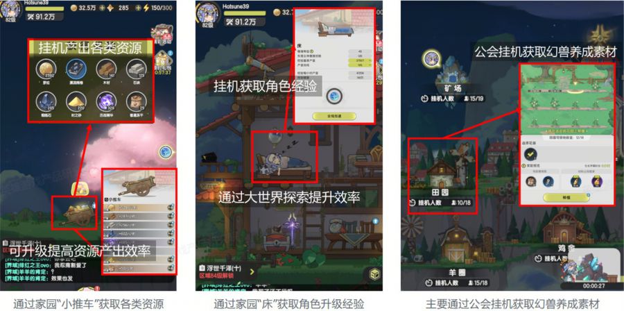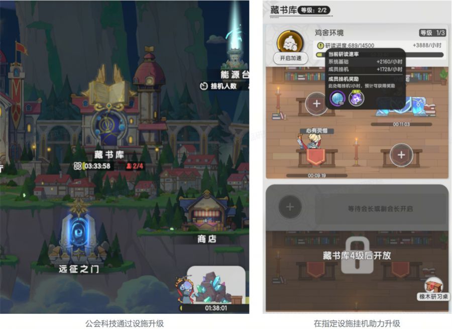 公会中拥有近似于SLG游戏中的挂机助力设施或科技升级的玩法,在不耽搁玩家时间的情况下能增强玩家对公会的归属感。同时这种挂机还能够玩家提供额外奖励,吸引玩家前去挂机。