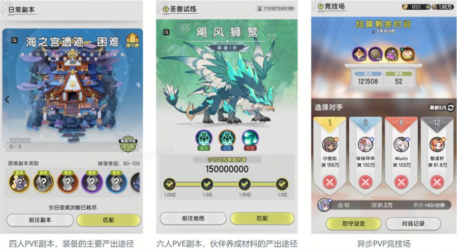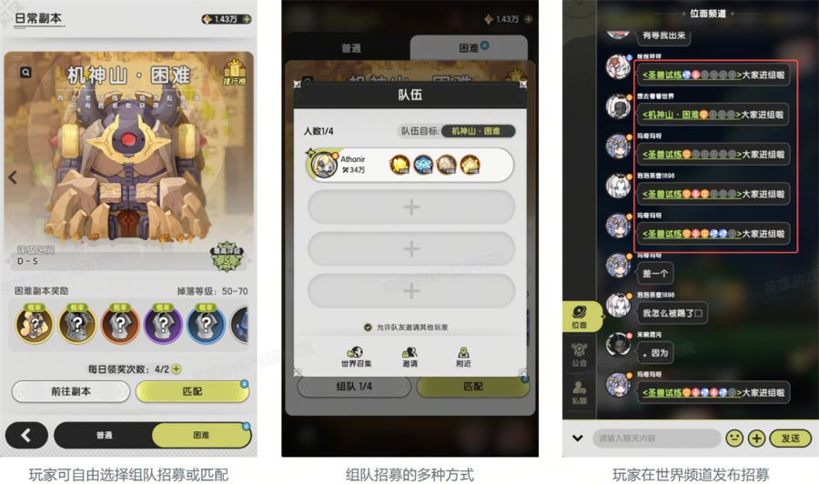 在每个阶段的前期,玩家因战力不足需要组队招募挑选队友,在中后期战力提升后则可以通过匹配的方式更快捷地进行组队并完成副本。
