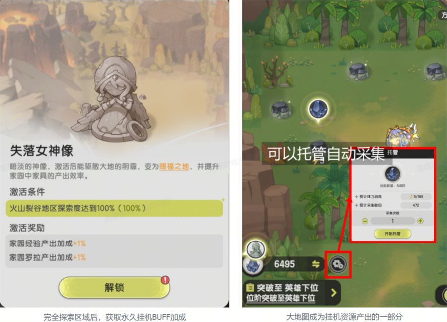 特别地,游戏在大地图中加入了区域完全探索奖励与素材收集玩法,与放置玩法强相关。玩家开图开荒更有动力,即使在游戏后期大地图也是部分挂机资源产出的途径。