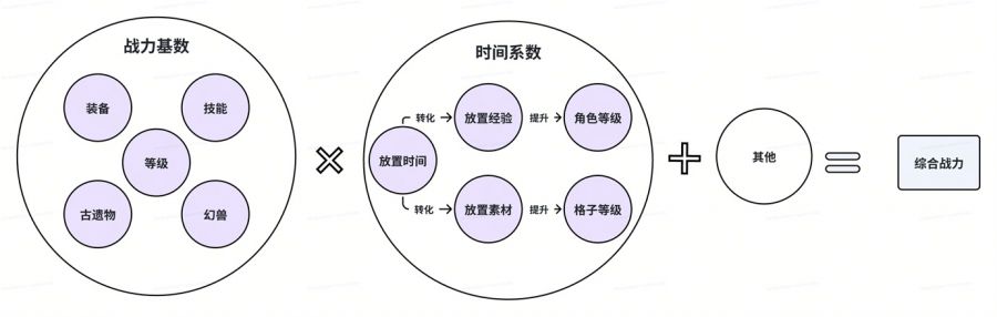 游戏中大部分战力均与放置时间挂钩,所有玩家均可体验到持续且稳定的战力提升。并且游戏中通过氪金获取的战力基数相对克制,巧妙控制大R与普通玩家的战力差距。可参考下面逻辑图。