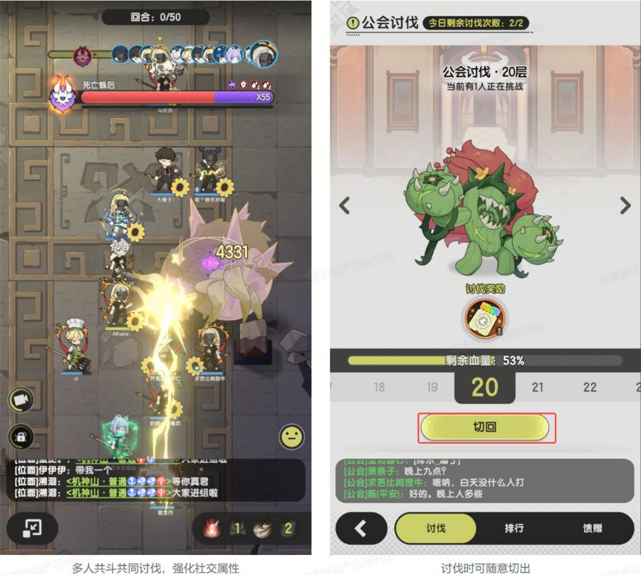 此外,公会的Boss挑战玩法(公会讨伐)还支持多名玩家同时讨伐,相较传统的公会Boss挑战的单人战斗,能够进一步强化玩家对于公会团体的认知,强化社交的属性。同时,公会讨伐时玩家可以随意切出进行其他的活动,本质上也可视为一种不耽误玩家其他进度的“挂机”玩法,降低玩家因其耽误时间而产生的负面情绪。
