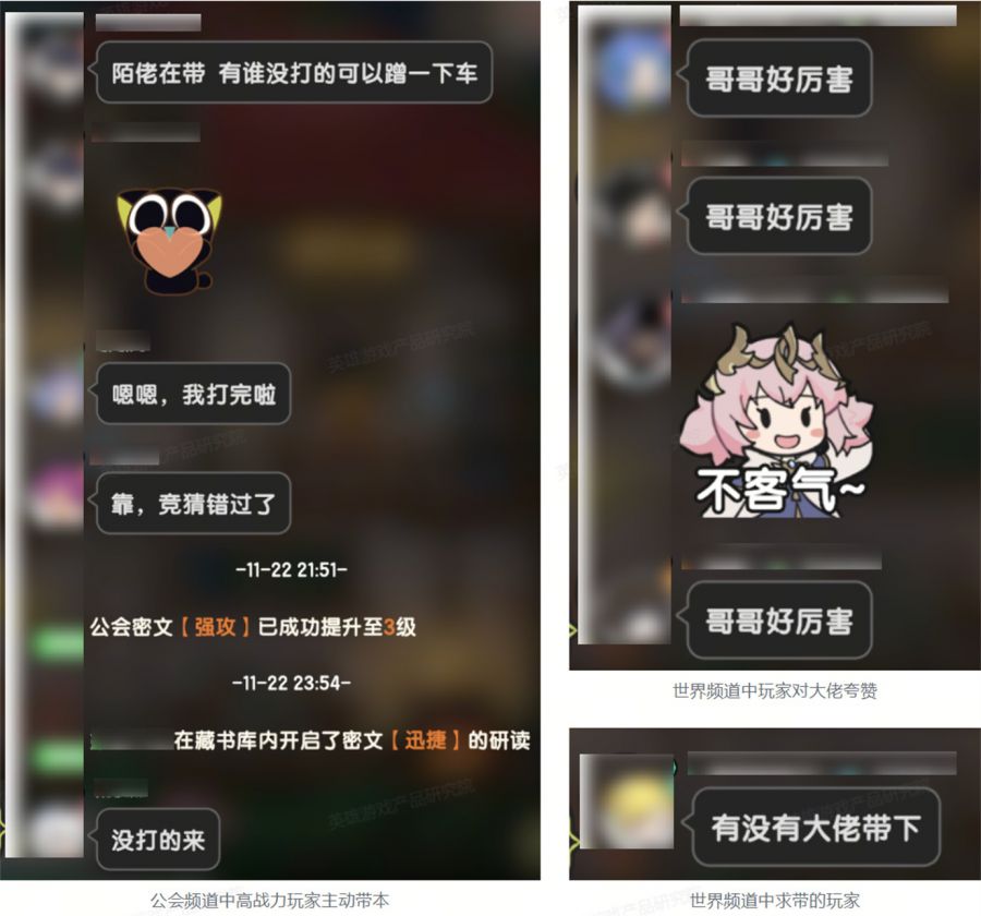 我们观察到,玩家经常会在世界频道或公会频道针对其MMO副本玩法“求带”(普通玩家)或“带人”(大R玩家)。而普通玩家在被带后会通过表情与文字等方式表达感谢。这样的互动满足了大R玩家的炫耀欲望,也能够让普通玩家也能完成相应的副本攻略。