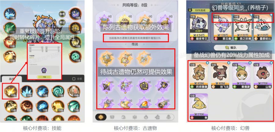 游戏中核心付费项为技能、古遗物与幻兽,付费深度极高且卡池呈现形式优秀,下面我们将逐一介绍。