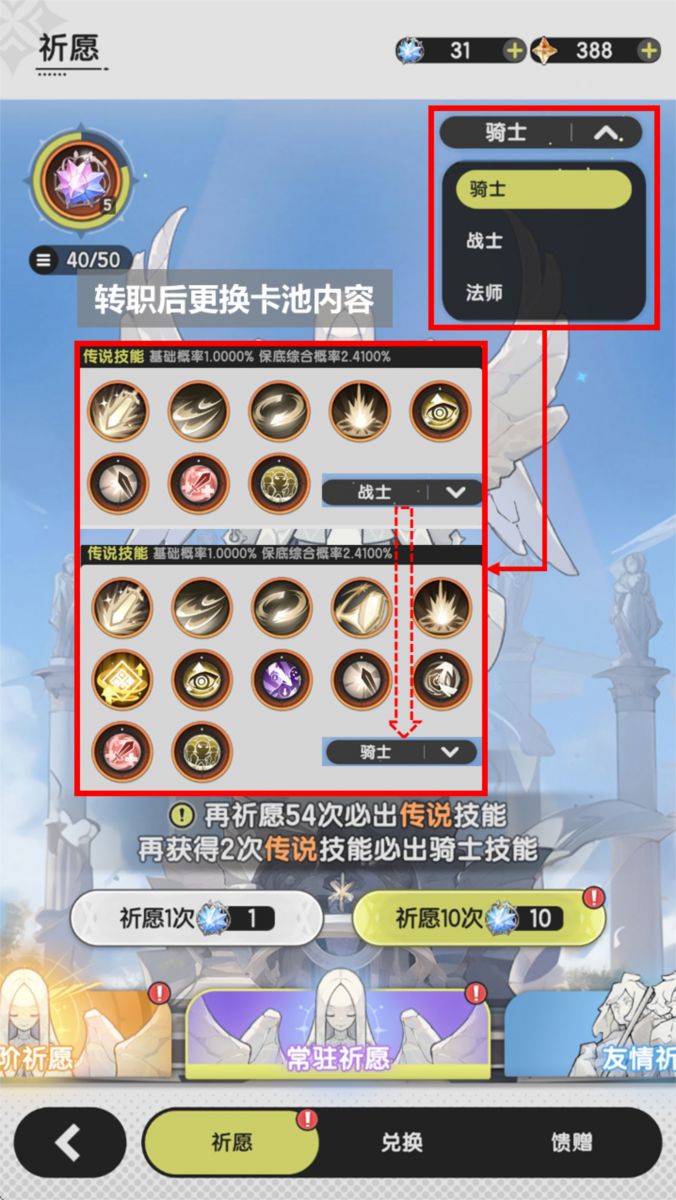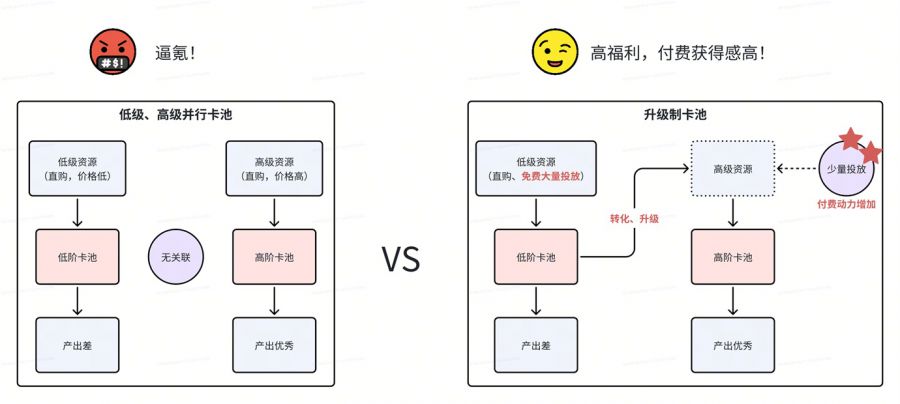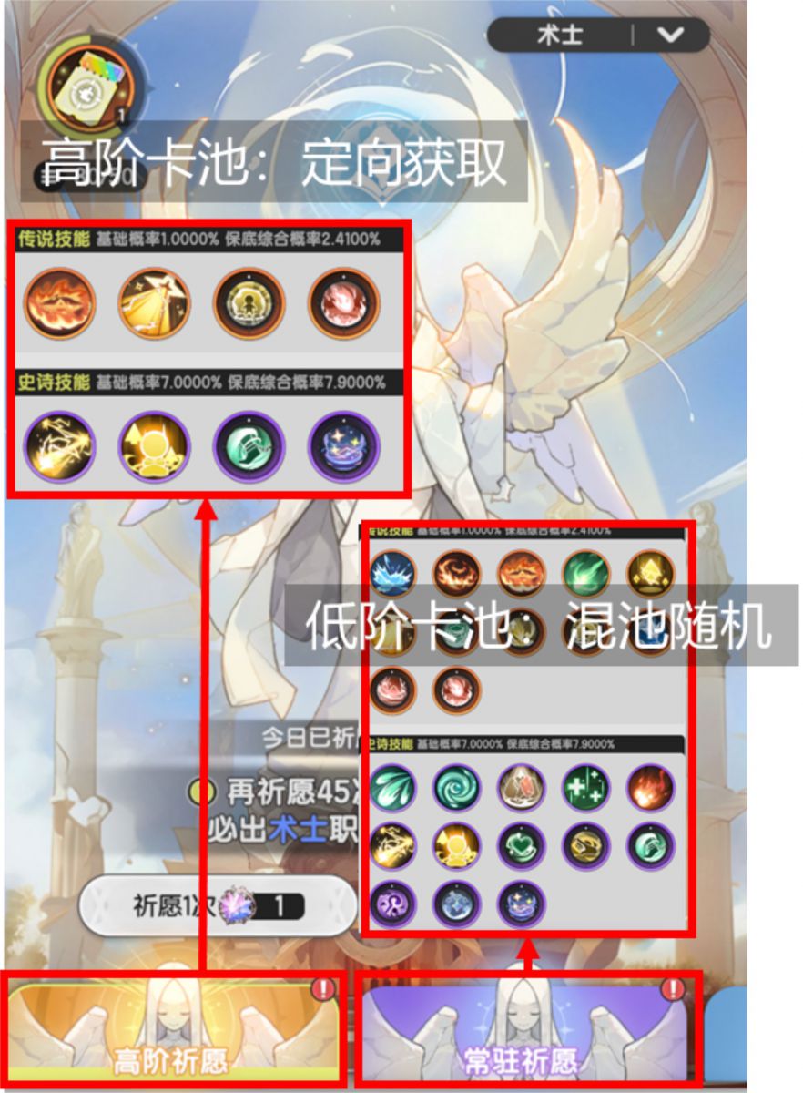 特别地,技能卡池由于转职的存在,低阶卡池通常会产出低阶职业技能(转职后污染卡池),而高阶技能卡池则可以定向获取当前所需职业的技能。此时,卡池升级机制就显得尤为重要。