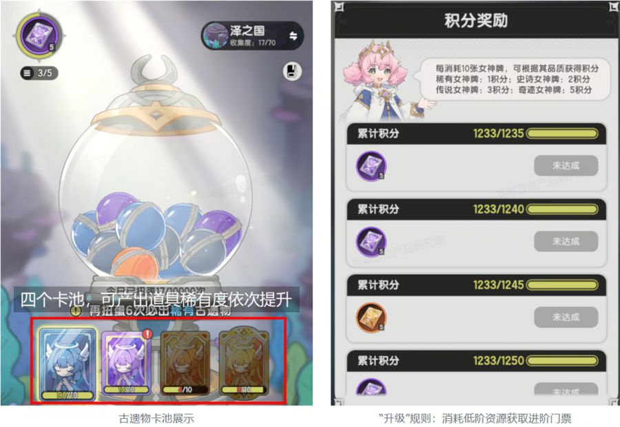 游戏中大部分卡池为“升级制”卡池:消耗低阶池资源可兑换高阶池门票。强化了玩家获得感。