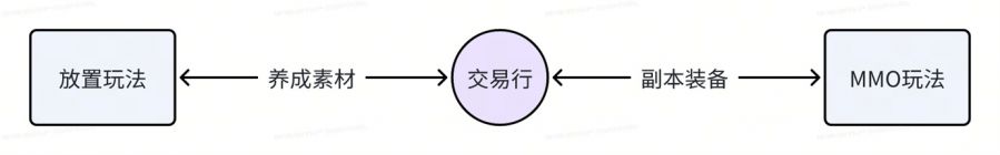 可以看出,交易行集成了游戏中的副本产出、放置挂机产出的各类商品,并通过付费与免费钻作为货币进行流转,耦合了MMO的副本玩法与放置挂机的养成内容。可参考下面逻辑图:
