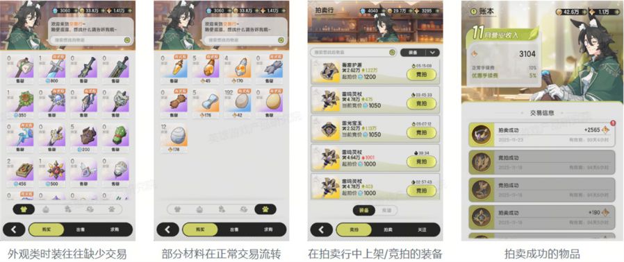 但在当前阶段,由于副本迭代速度快,材料需求缺口一般,大量商品处于有价无市或有市无价状态,缺少交易,仅有少量商品(如拍卖行中的极品装备,缺乏的养成素材或能永久提升属性的食物/食谱等)服务于排行榜前列追求战力的大R与超R玩家。
