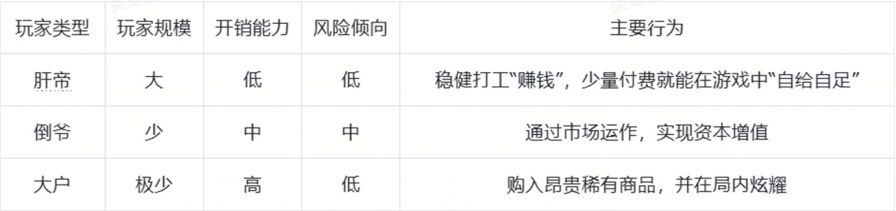 根据观察,我们以玩家围绕交易行的不同行为,将参与交易行行为的玩家分为3类:“大户”、“倒爷”与“肝帝”。