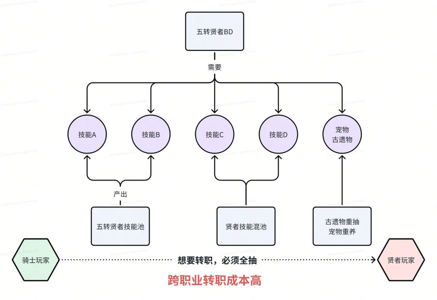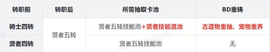 以五转时骑士→贤者转换职业为例,骑士玩家为了补全对应BD,需要抽取贤者职业的技能混池,并重抽/培养贤者的古遗物与宠物,而贤者玩家则只需抽取其五转卡池,如下图所示: