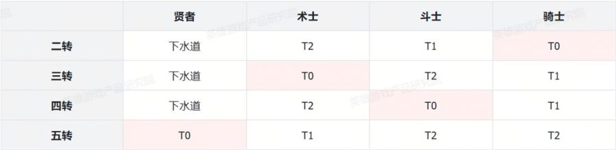 目前游戏职业间不平衡,相同职业在不同转职阶段体验方差过大。在相同氪金额度的情况下,不同职业间体验天差地别。可以看到各个转职阶段强力角色分属不同职业,如果想一直追求T0职业,则必须每次均跨职业转职。