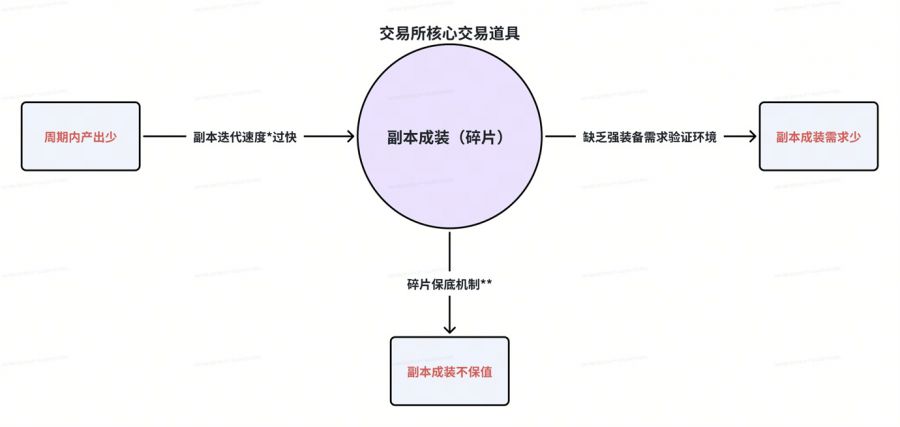 目前交易行内最核心的流通道具为副本成装。然而,副本迭代迭代周期过短,导致装备价值衰减速度过快。同时,碎片保底机制进一步加剧了装备的不保值性,使得副本装备在市场流通中的价值预期大幅降低。此外,游戏内缺乏对强装备需求的有效验证场景,玩家对副本成装的实际需求动力不足。最终造成游戏仅有少数前排高活跃度玩家参与交易,交易行在广泛玩家群体间存在感不强。
