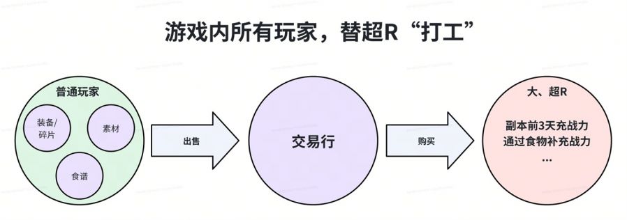 但对于服务器前排玩家来说,为维持战力排行,可以(必须)通过交易行购入当期副本装备快速提升战力,几乎所有最优质的道具都通过交易行流向被高战玩家,最终形成了服务器内所有玩家都在替大超R“打工”的局面。